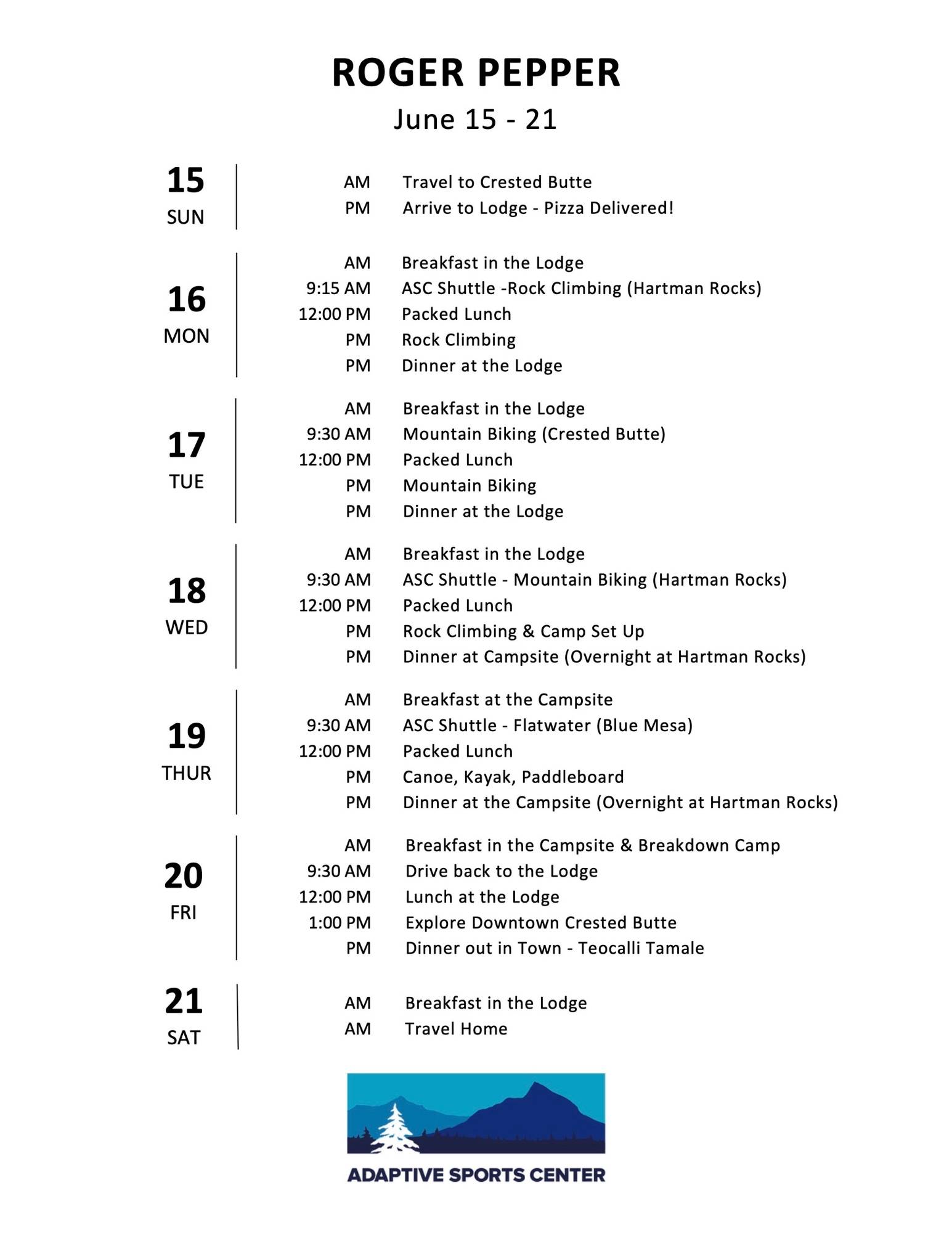 January 4-10, 2026 Application due November 1 APPLY HERE If you are interested in future winter/summer camps, please fill out our interest form so we can contact you when future applications open.INTEREST FORM Twice a year, we welcome a group of up to 10 teen burn survivors to the Adaptive Sports Center. These camps offer a welcoming environment for teens to connect with others who have similar experiences. For the week, they stay in our deluxe lodging, enjoying shared living areas and kitchen that provide ample time to get to know each other and independently make meals together. In the winter, days are filled with skiing, snowboarding, and snowshoeing. In the summer, they will enjoy paddleboarding, climbing, rafting, hiking, and mountain biking. Whether campers are just learning a new sport or have advanced skills, they will receive expert guidance from highly-trained instructors. In their downtime, they can relax at the lodge, enjoy great meals, explore the historic town of Crested Butte, participate in team building exercises, and art projects. The friendships and memories formed during their time at camp will last long after the last ski run or paddle stroke on the lake. The Adaptive Sports Center helps the campers set and achieve goals, on and off the slopes, leaving them encouraged and energized. Positively challenged and supported. Exhilarated and transformed. Camp Overview: Summer Activities: Campers will have the chance to paddleboard, kayak, canoe, rock climb, camp and mountain bike with expert instruction available for all skill levels. Winter Activities: Campers will have the chance to engage in skiing, snowboarding, snowshoeing, and indoor climbing with expert instruction available for all skill levels. Additional Experiences: Beyond the winter and summer sports, campers can relax at our lodge, enjoy delicious meals, explore the historic town of Crested Butte, and participate in team-building activities and creative projects. Community and Personal Growth: The camp is designed to foster lasting friendships and memorable experiences while helping campers set and achieve personal goals. They will leave feeling positively challenged, encouraged, and transformed. Camp Details: Location: Mt. Crested Butte at the Adaptive Sports Center Group Size: Up to 10 participants Supervision: Includes one nurse and overnight supervision by ASC staff Cost: FREE! The Adaptive Sports Center will cover the cost of programming, lodging, food, and travel. Eligibility: Teen burn survivors ages 14 to high school graduate DOWNLOAD INFO PACKET HERE PHOTO GALLERY Contact: Reach out to Sophie Chiado and Richard Paylor with questions!Sophie Chiado - schiado@adaptivesports.org | (970)349-2296 x117Richard Paylor - richard@adaptivesports.org | (970)349-2296 x114 HISTORY OF THE CAMPS In 1999, Allison Massari established the Roger Pepper Adventure Camp after surviving a terrible automobile accident. She formed the camp through the Adaptive Sports Center and named it after Roger Pepper, a selfless onlooker who pulled her from the fiery wreckage and saved her life. The mission of the Roger Pepper Adventure Camps is to promote and provide outdoor recreation to teenagers with severe burns. The activities offered in these summer and winter camps teach young burn survivors new life skills, build self-confidence, and empower them to be more comfortable with their physical and emotional scars. For more information about the camps, please contact Richard Paylor, CTRS, at richard@adaptivesports.org or (970) 349-2296 x114 SUPPORT The Roger Pepper Adventure Camps couldn't happen without the support of our generous donors. If you'd like to contribute, please click the button below. Proudly supported by: