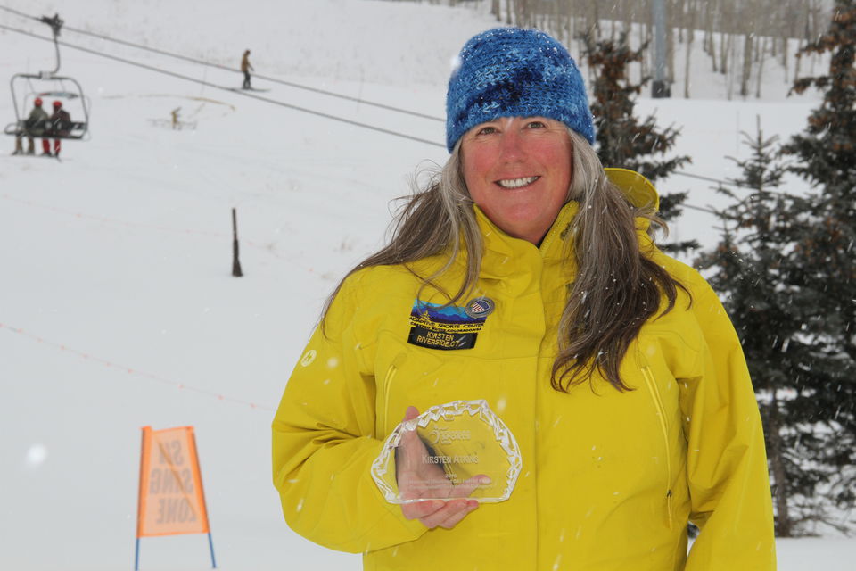 Disabled Sports USA (DSUSA) has inducted Adaptive Sports Center instructor Kirsten Atkins into its Snow Sports Hall of Fame. DSUSA presented Atkins with the prestigious award at the 2016 Hartford Ski Spectacular December 3 in Breckenridge. Atkins has been an instructor with the Adaptive Sports Center since its founding in 1987 and has helped pioneer many of the advances in adaptive snow sports instruction over the past thirty years. “Working with people with disabilities chose me,” Atkins says. “I have an older brother with high functioning autism. I answered an advertisement in the paper during my first winter in Crested Butte for the Adaptive Sports Center, which used to be known as the Physically Challenged Ski Program. I thought it would be a great way to combine my love for skiing and my life experience with people with disabilities.” Atkins’ career began in Crested Butte, but has taken her around the world. She spent time working in Europe teaching British students with disabilities and training both instructors and volunteers. Her career with the Adaptive Sports Center also afforded her the opportunity to help spearhead a certification program for adaptive ski instructors in Argentina, Alaska and Idaho. “It’s an incredible honor to be inducted into the DSUSA Hall of Fame,” Atkins says. “I couldn’t have done it without the help of a huge community of fellow instructors and participants.” “Kirsten’s contributions to the adaptive sports industry through her work with the Adaptive Sports Center, the PSIA, and the Argentine ski instructors association have affected hundreds of adaptive instructors throughout the world, which in turn has helped change the lives of thousands of people with disabilities in a profound way,” says Adaptive Sports Center Executive Director Christopher Hensley. “As educators in this industry, it’s been an honor to build a strong foundation for adaptive snowsports instructors and participants,” Atkins says. “I believe it is up to all of us to support the next generations of adaptive instructors so that we may continue to positively impact the lives of people with disabilities for decades to come.”
