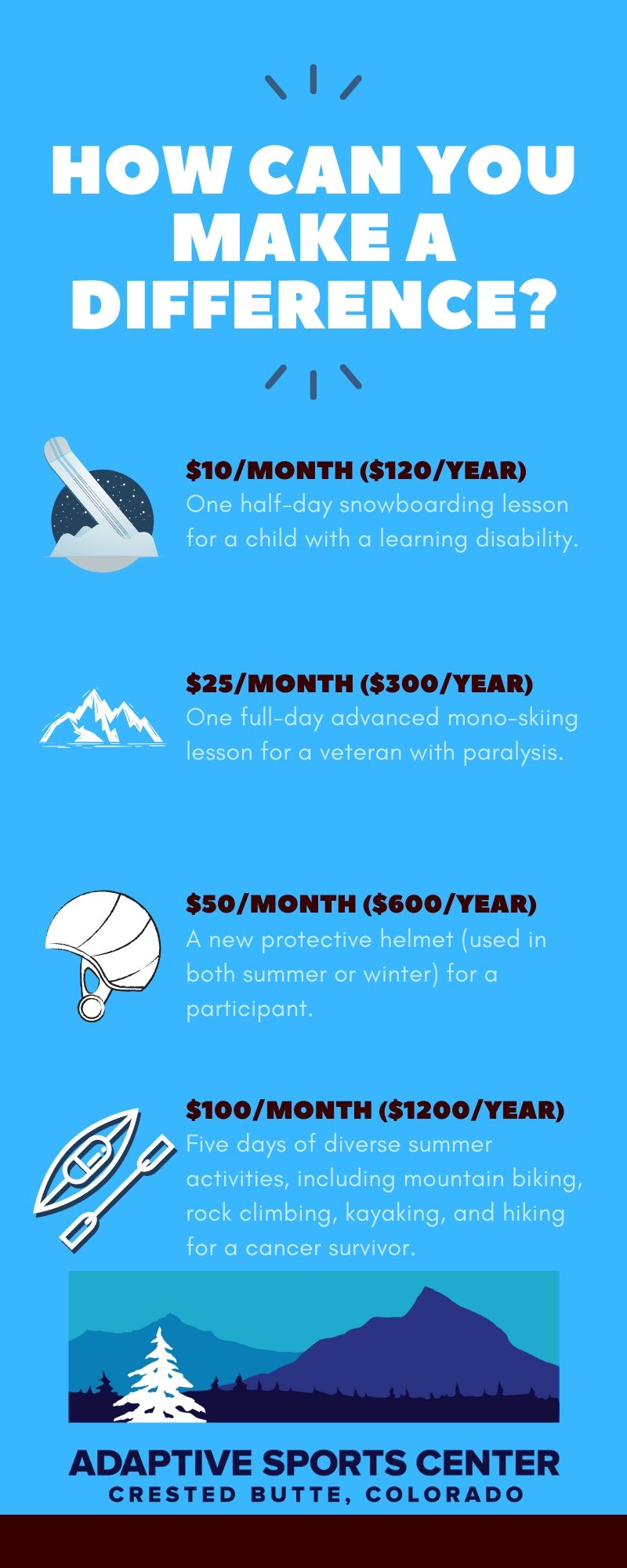 Are you looking for a way to increase the impact your donations have on the Adaptive Sports Center? Help the ASC reach new heights by joining our monthly donor club The ASCent. Members of The ASCent will be recognized in newsletters and offered early RSVP and Registration options at many of our events through the year. "We give monthly because Adaptive is our son's happy place. He's been participating since 2017 and we've seen his self-confidence and skill set soar. We want others to have the same opportunities to grow through outdoor recreation, and the Adaptive Sports Center has the tools to make that happen." -Aimee & Matt Hoyt, Monthly Donors Each donation to the Adaptive Sports Center helps us empower and advocate for our participants, while maintaining our endless pursuit of fun in the outdoors. By joining The ASCent, you will play an integral role in helping us achieve our mission--every month of the year--from our snowy winter lessons to the waist-deep flowers of the summer season. Your donation may also be eligible for a Colorado State tax credit. The Adaptive Sports Center has been approved as a Region 10 EZ Contribution Project. What that means is that a taxpayer who makes a monetary contribution of $250 or more to the ASC is entitled to a Colorado Income tax credit of 25% of the value of the contribution up to a maximum credit of $100,000 per year. With federal deductions, this can mean that a $10,000 donation may only cost the donor $5,000 or less.